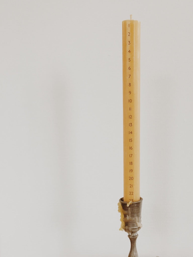 Cette bougie de l’Avent artisanale en cire d’abeille 100 % naturelle t’accompagne jour après jour pendant la période de l’Avent. La bougie calendrier de 24 jours est marquée d’une échelle délicate de chiffres, pour brûler un petit peu chaque jour et se rapprocher lentement de Noël. Une belle alternative au calendrier de l’Avent classique – faite de matériaux naturels et avec beaucoup d’amour. La bougie de l’Avent en cire d’abeille allie tradition et simplicité. Idéale pour tous ceux qui recherchent un rituel de l’Avent conscient et durable.