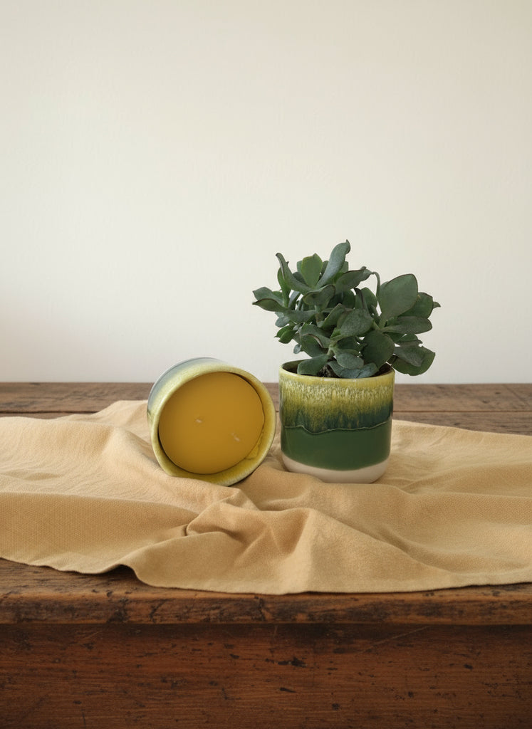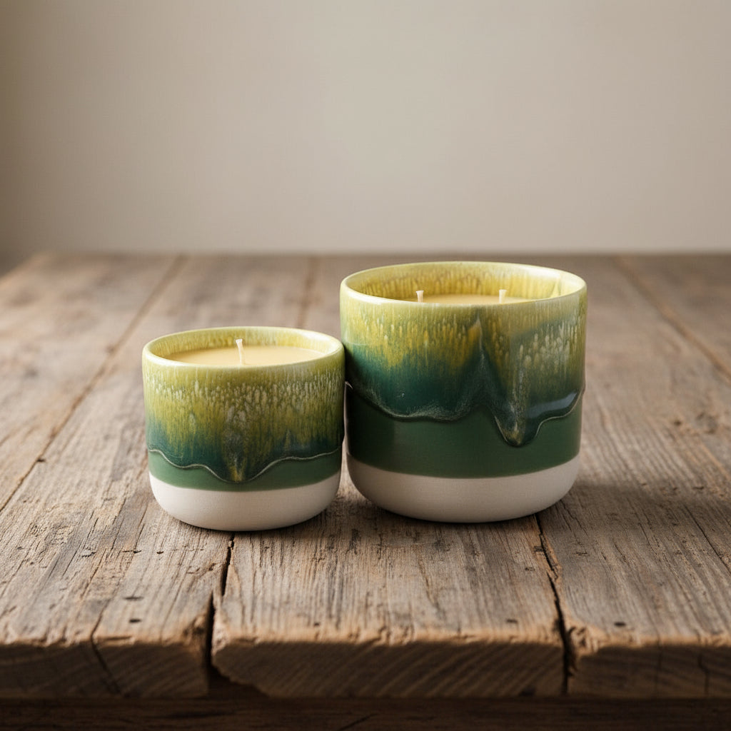 Bougie en cire d'abeille avec deux mèches en porcelaine verte
