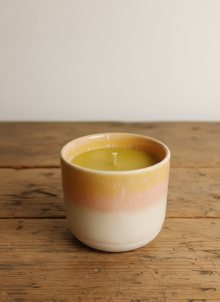 Bougie en cire d'abeille dans une tasse porcelaine rose