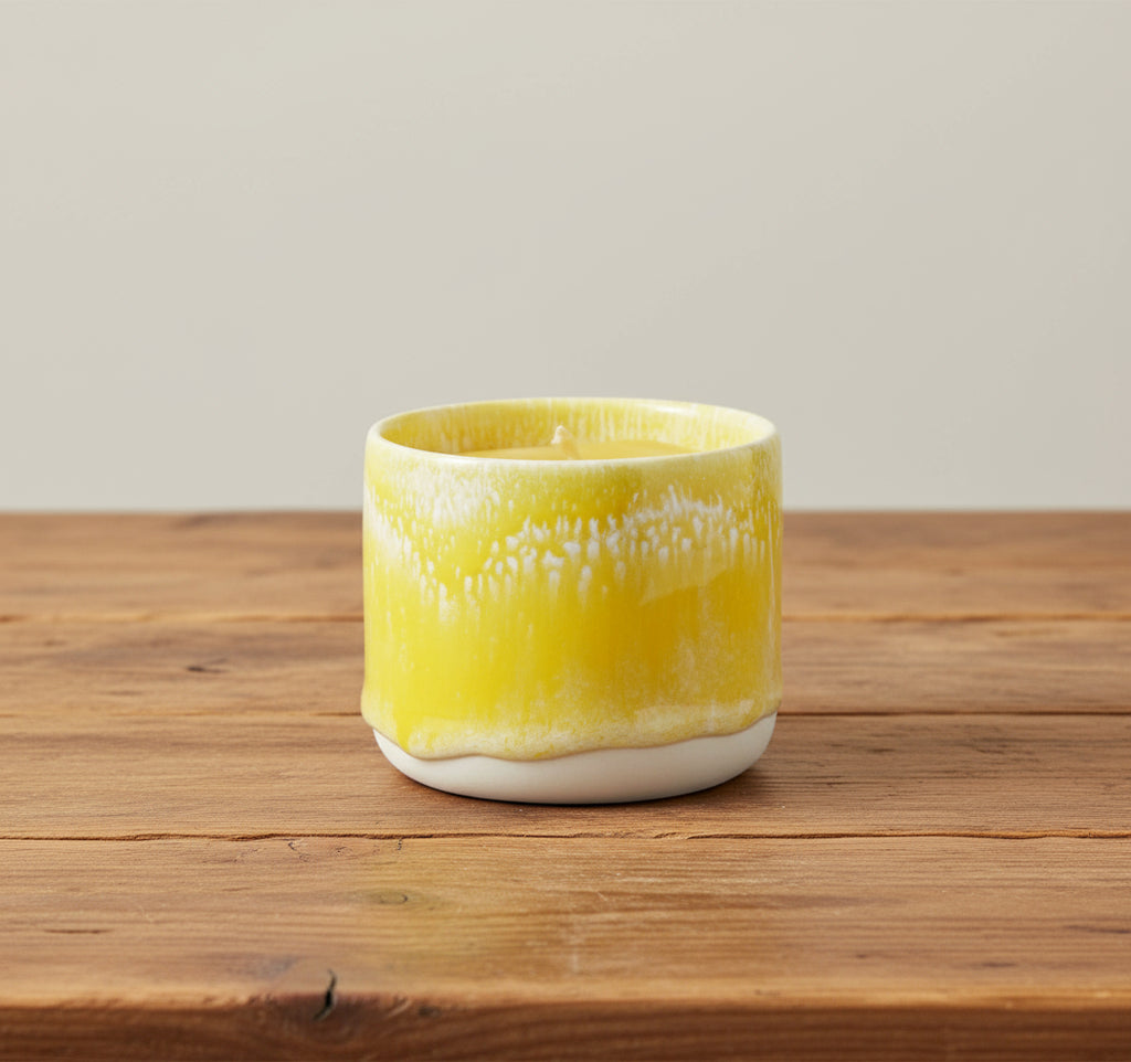 Bougie en cire d'abeille dans une tasse porcelaine jaune